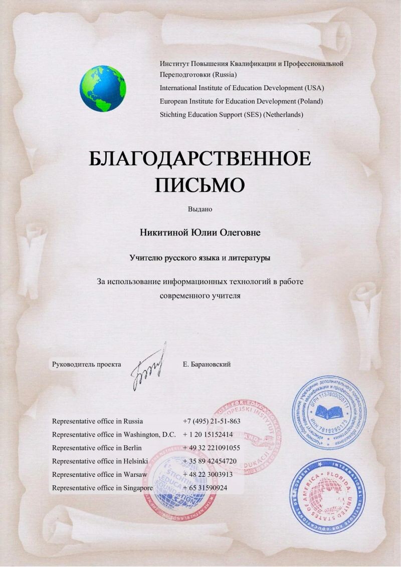 - Благодарственное письмо за использование информационных технологий в работе современного учителя, 2023 г.