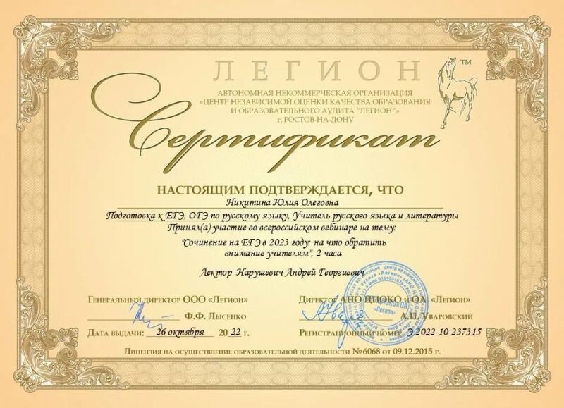 - Центр независимой оценки качества образования и образовательного аудита «Легион», всероссийский вебинар «Сочинение на ЕГЭ в 2023 году: на что обратить внимание учителям».