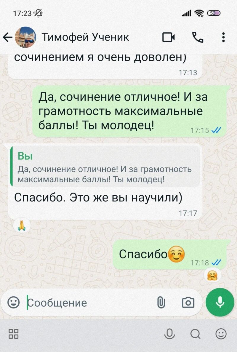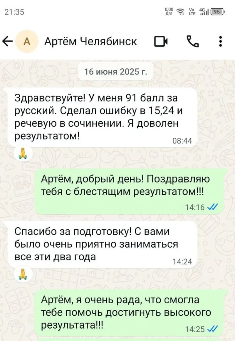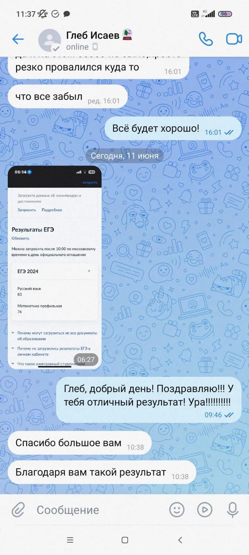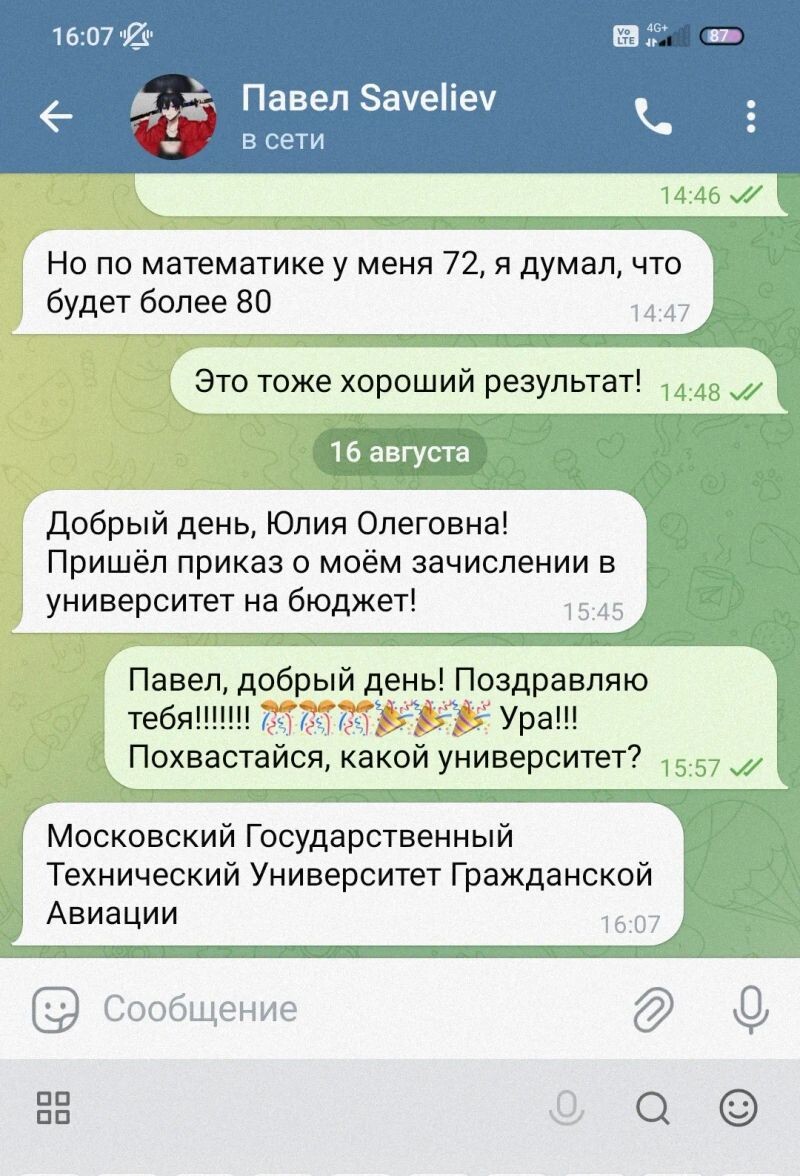 Я отлично занимался. Очень хороший преподаватель. Все я сдал, даже поступил, то есть она мне очень помогла. Спасибо ей огромное. Она именно делает то, что нужно. То есть она поняла то, что я от нее хотел, и именно мы делали упор на то, что у меня было слабенькое, она именно выявила это, что мне надо было подтянуть. И за этот месяц мы с ней очень хорошо это все проштудировали.