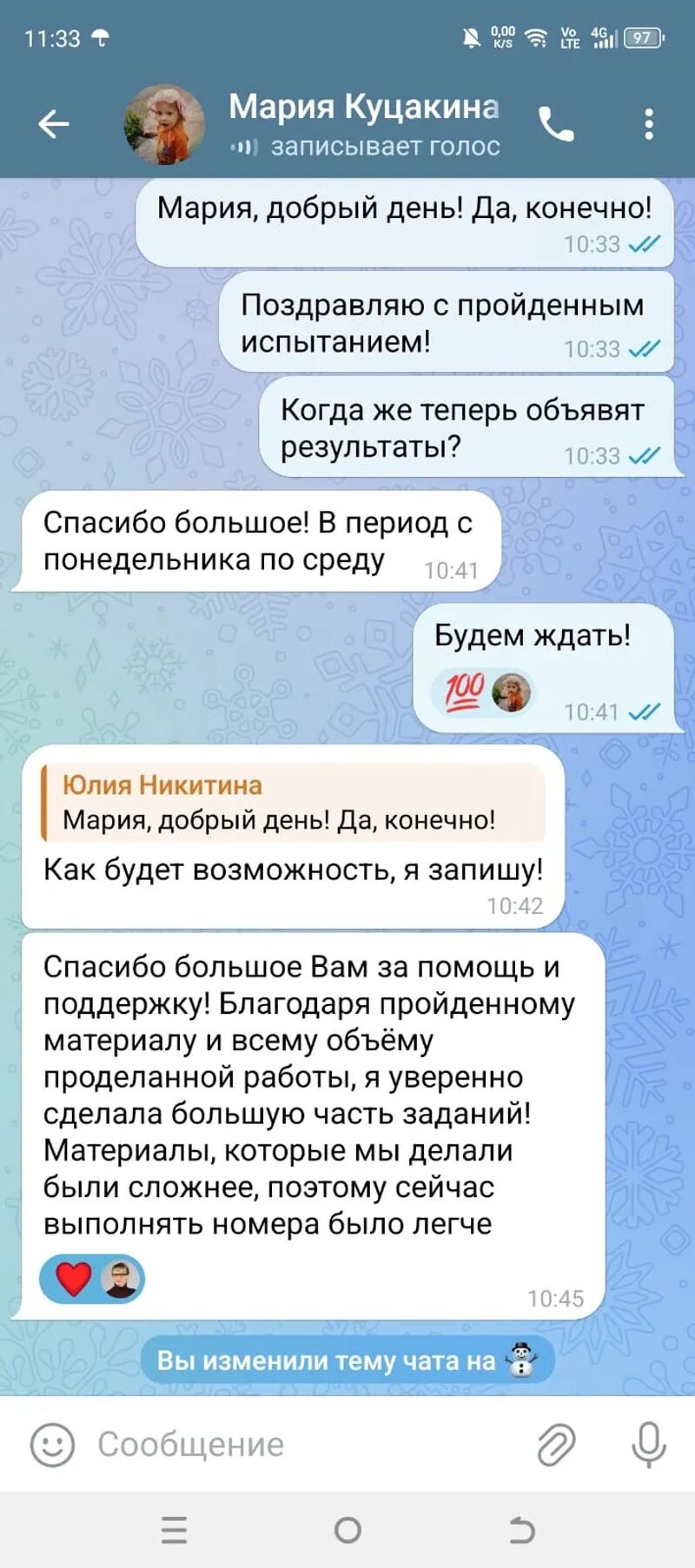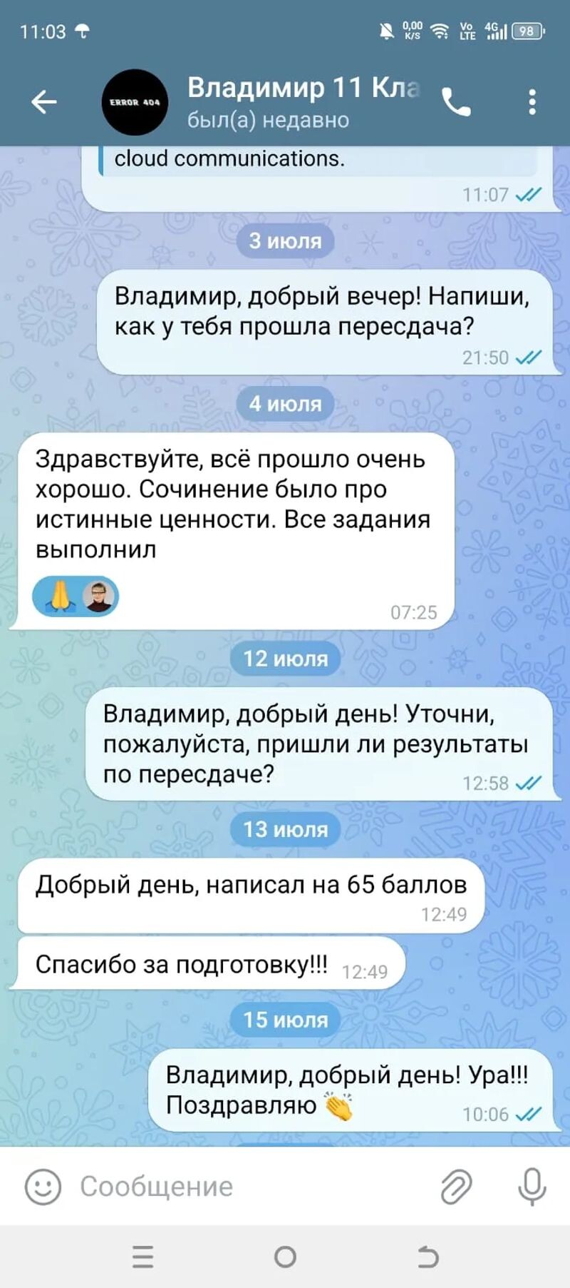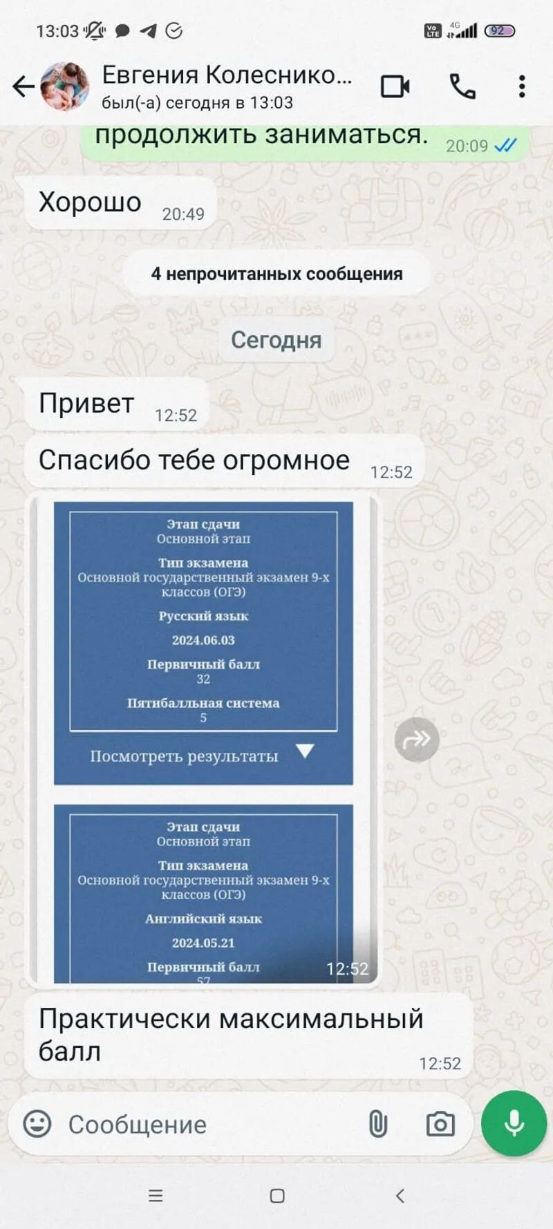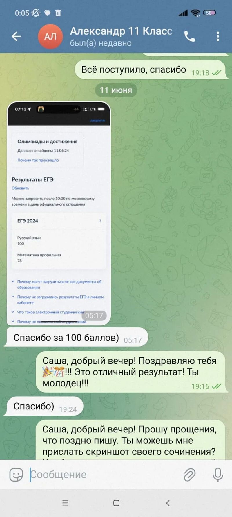 Я отлично занимался. Очень хороший преподаватель. Все я сдал, даже поступил, то есть она мне очень помогла. Спасибо ей огромное. Она именно делает то, что нужно. То есть она поняла то, что я от нее хотел, и именно мы делали упор на то, что у меня было слабенькое, она именно выявила это, что мне надо было подтянуть. И за этот месяц мы с ней очень хорошо это все проштудировали.