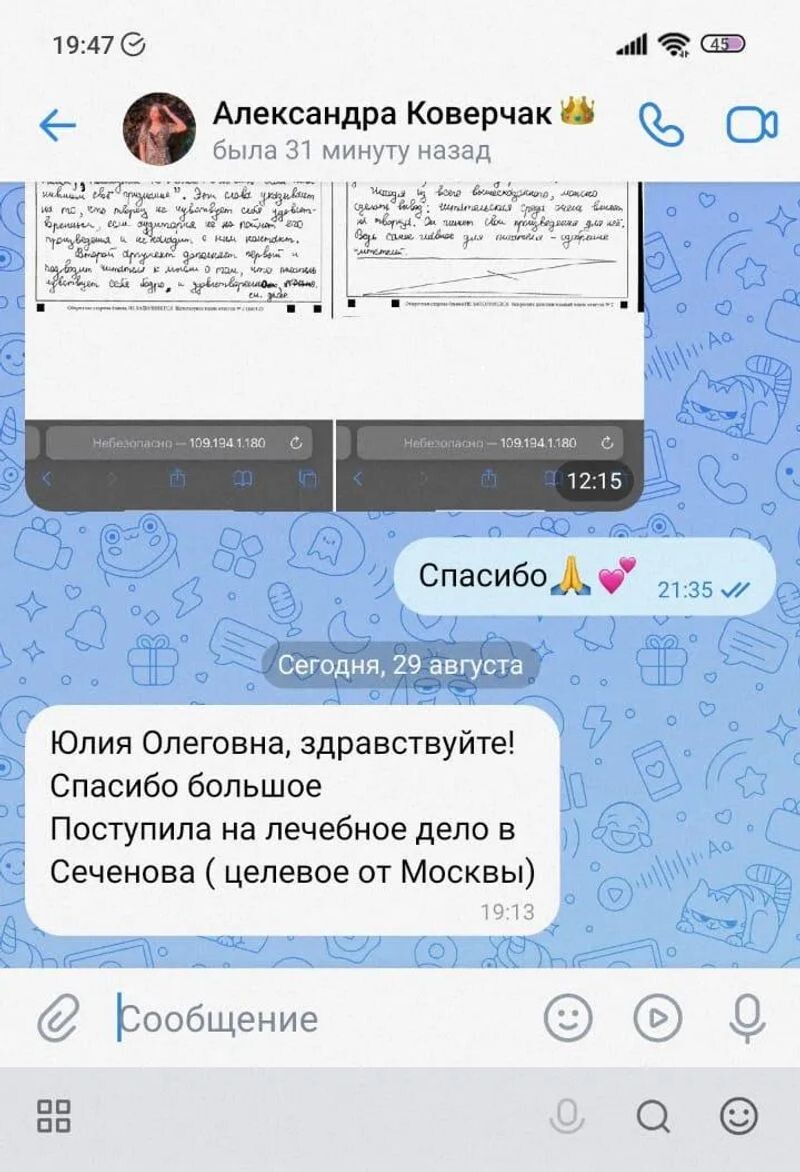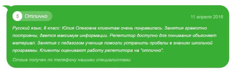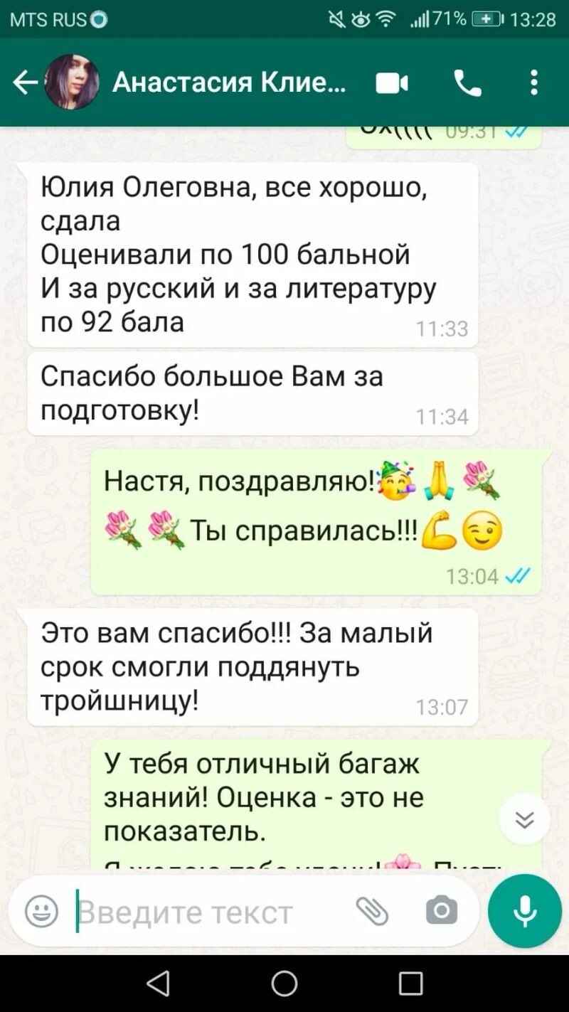 Юлия Олеговна – преподаватель очень классный. Она психологически хорошо нам помогла, морально подготавливала дочь перед экзаменом. Вот она действительно отлично с нами поработала. Эта женщина прекрасно справилась с поставленной задачей, а ведь у нас были и другие репетиторы до этого. Но к ЕГЭ по русскому языку мы именно с ней подготовились за предельно короткий срок и хорошо написали этот экзамен. За работу репетитору большое спасибо, дочь тогда отлично поработала с этим педагогом из Брянска.