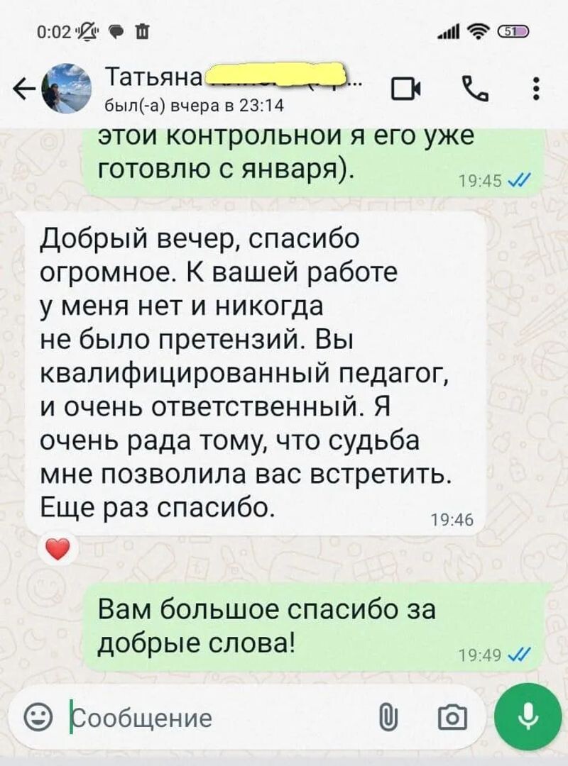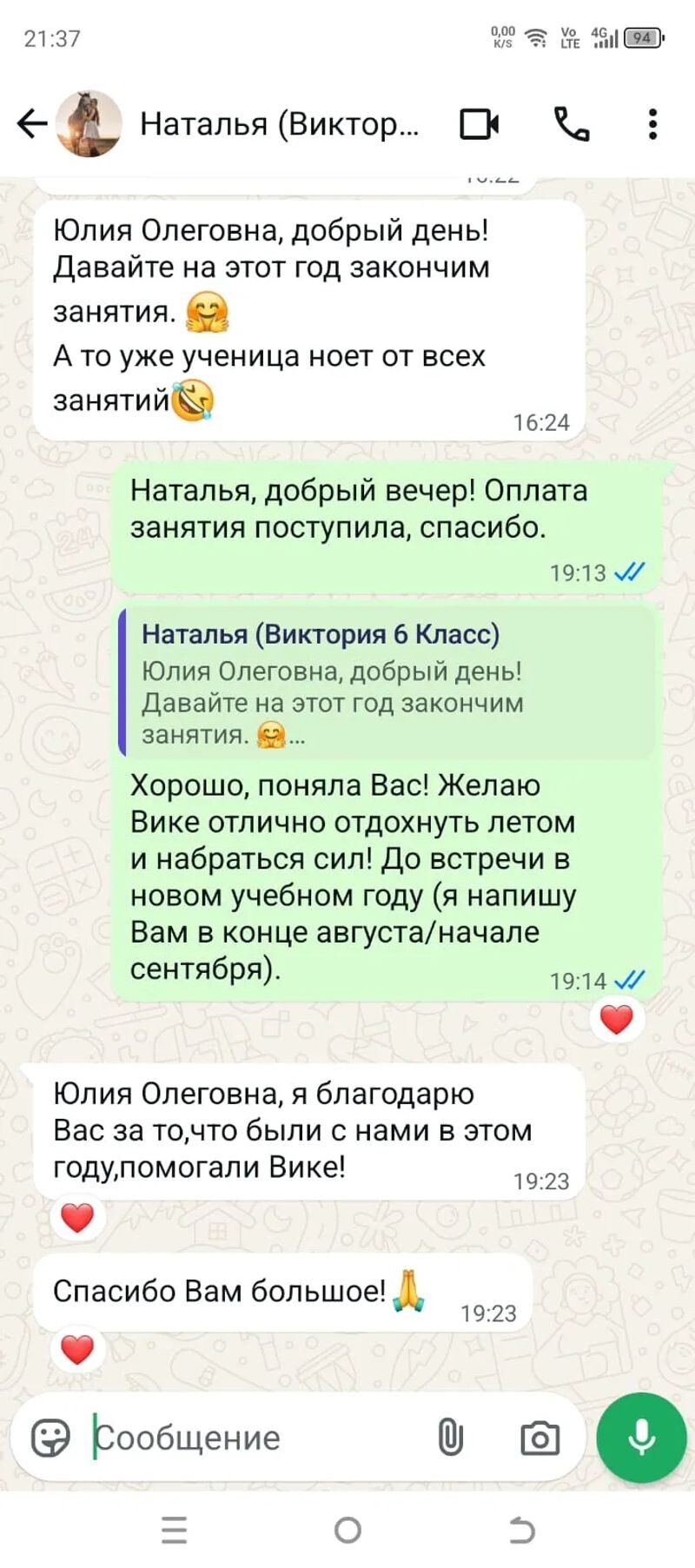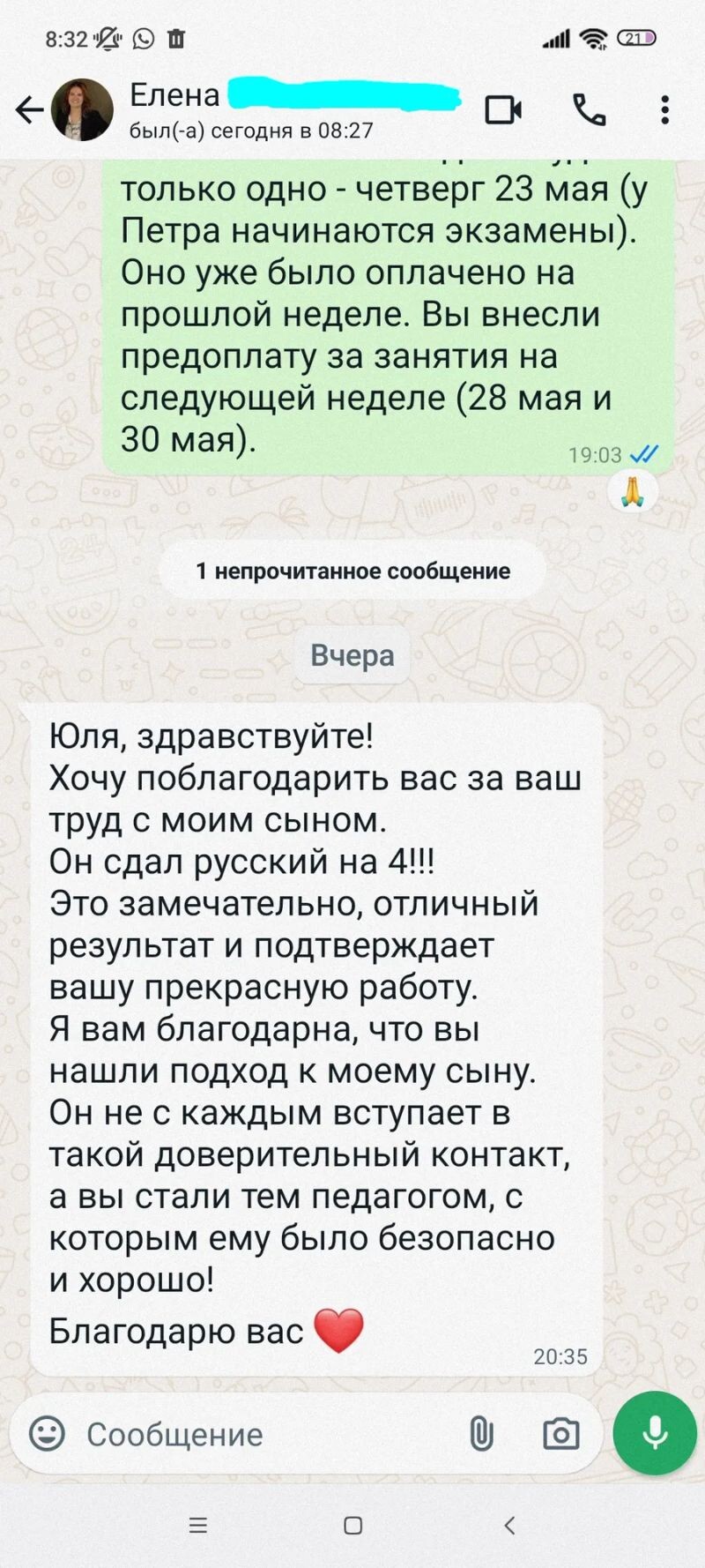 Хороший педагог, могу рекомендовать. У неё хороший контакт с учениками. У нас такой сложный вопрос. Пока занимались, было нормально, подтягивался ребёнок. Просто у нас другой вопрос возник, внутренний, семейный. Сейчас мы занятия прекратили, результаты хуже стали. Юлия Олеговна нам была бы нужна, но не сейчас. Она давала материал больше по теме, что нам была необходима, что ребёнок не понял до этого. Действительно, в основном восполнение пробелов. Был и захват того, что на данный момент проходят. Если я её о чём-то просила, то она никогда не отказывала. Они и домашние задания вместе разбирали. Она профессиональные обязанности выполняет очень хорошо. Причём я её рекомендовала подруге, педагог занималась с её сыном, вроде и они все довольны. Претензий к ней вообще нет. Просто был период, что финансово не получалось, а потом сын ничего не хотел. Может быть, летом свяжемся, если она сделает нам любезность и возьмёт, то будем заниматься.