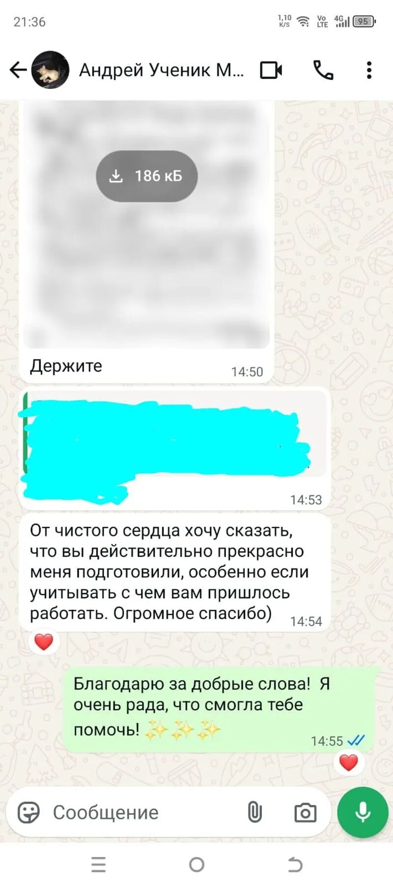 Согласно отзывам 💬, Юлия Олеговна — это специалист, который умеет завоевывать доверие учеников и их родителей. Ее главные преимущества включают высокий уровень компетентности и способность адаптировать методику преподавания к индивидуальным потребностям каждого ученика, что демонстрирует ее профессионализм и внимание к деталям. Искреннее стремление Юлии Олеговны помочь ученикам раскрыть свой потенциал и доброжелательное отношение к ним создают комфортную атмосферу для обучения. Это позволяет ей не только эффективно передавать знания, но и поддерживать школьников морально, что, несомненно, играет важную роль в подготовке к экзаменам.