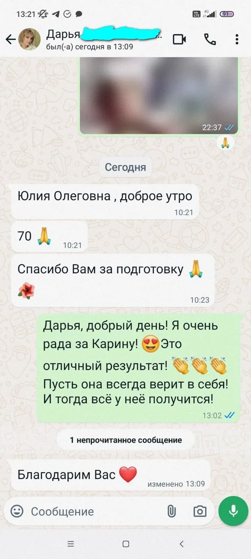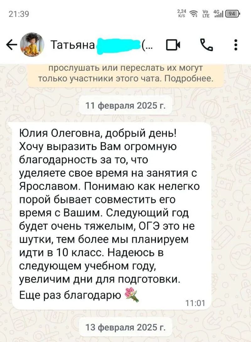 Многие родители и ученики отмечают не только профессиональные качества Юлии Олеговны, но и ее позитивное, искреннее отношение, а также готовность поддержать в трудную минуту. Благодаря этому сотрудничество с Юлией Олеговной превращается в приятный и плодотворный процесс, результаты которого очевидны. Это делает ее ценным специалистом, которого с уверенностью рекомендуют другим.