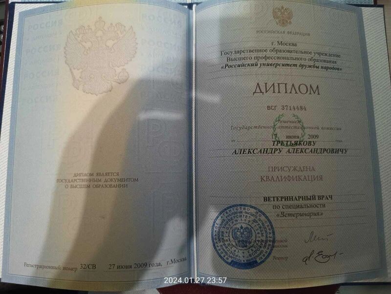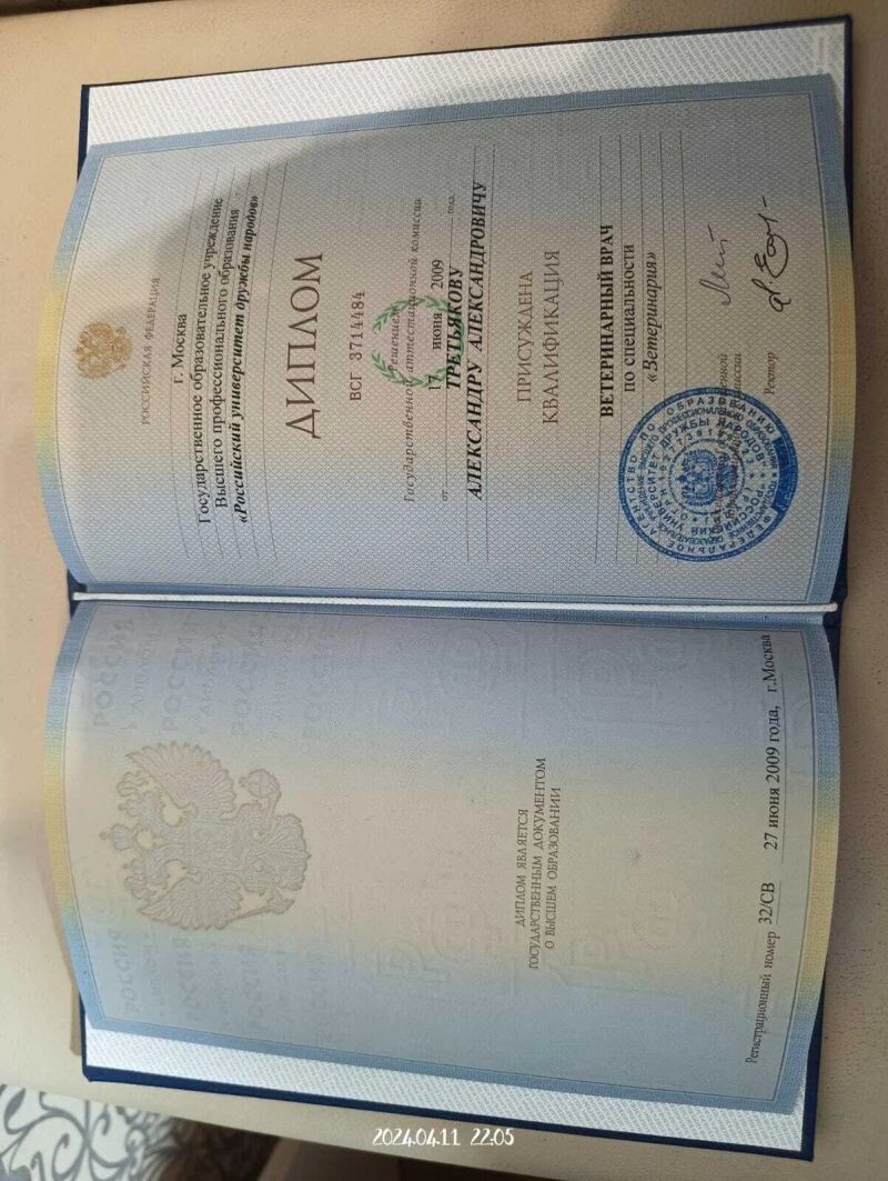 - Российский университет дружбы народов, квалификация «ветеринарный врач», специальность «ветеринария», 2009 г.