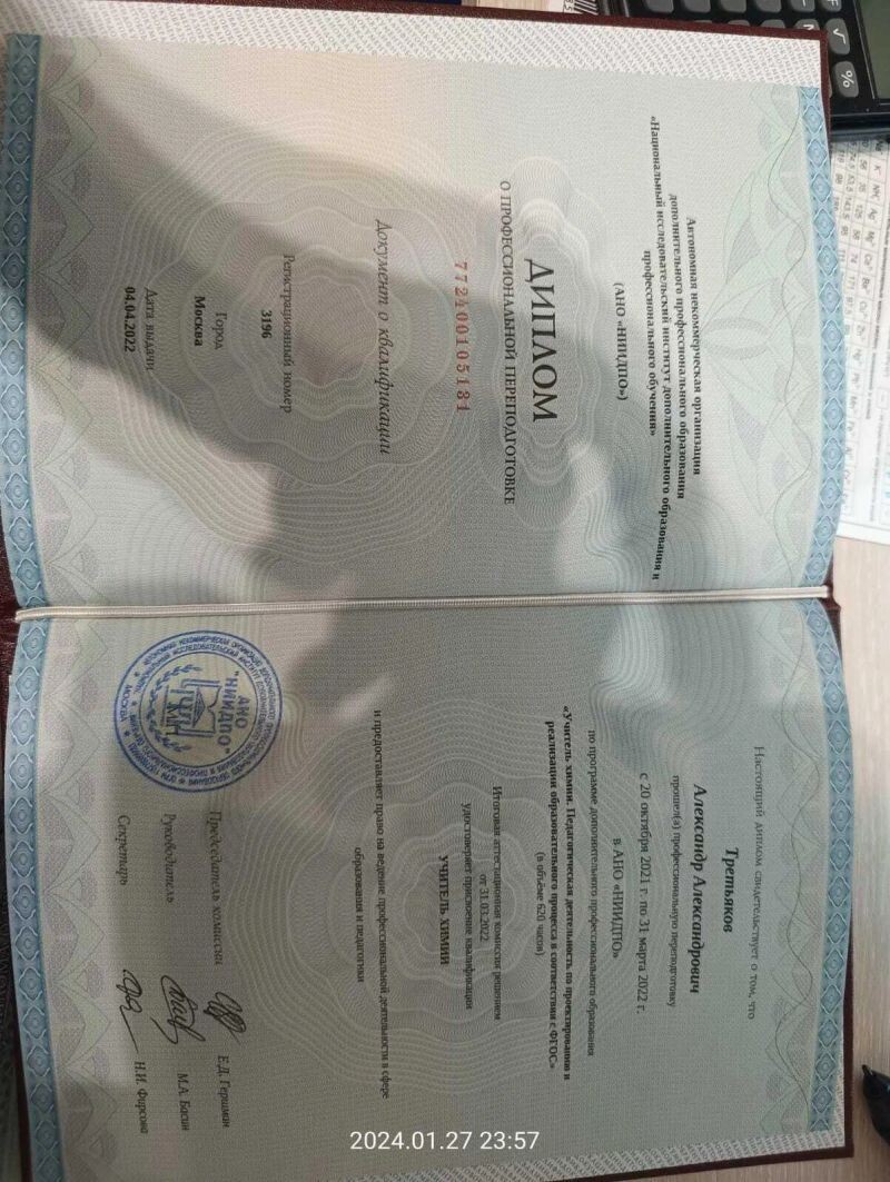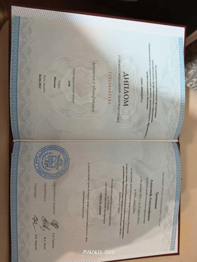 - АНО «НИИДПО», учитель химии, педагогическая деятельность по проектированию и реализации образовательного процесса в соответствии с ФГОС, квалификация «учитель химии», 2021–2022 гг.
