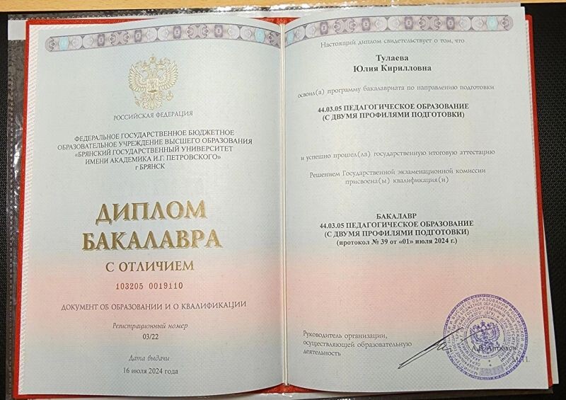 - Брянский государственный университет имени академика И.Г. Петровского, факультет иностранных языков, бакалавр 44.03.05 Педагогическое образование (с двумя профилями подготовки), 2019–2024 гг.