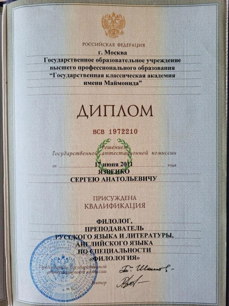 - Государственная классическая академия имени Маймонида, филология, филолог, преподаватель русского языка и литературы, английского языка, 2006–2011 гг.