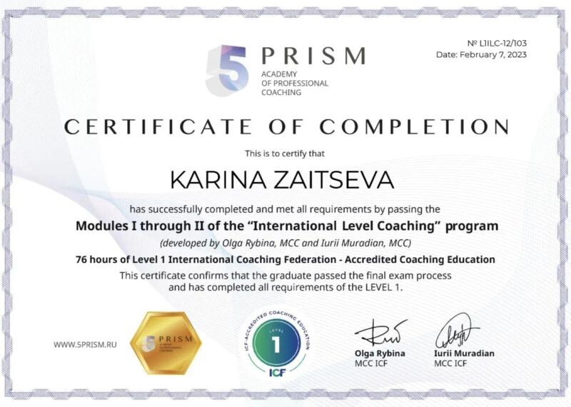 - Академия профессионального коучинга 5 призм, международный уровень коучинга, 2023 г.
