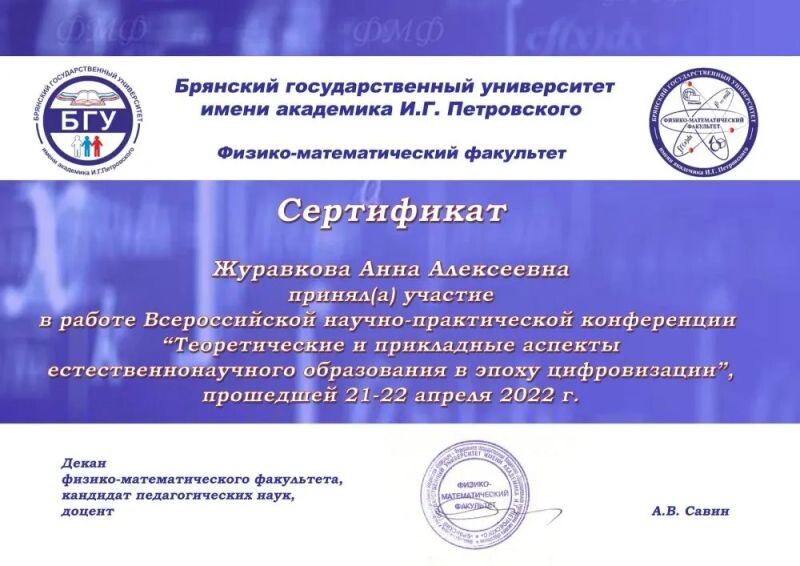 - Сертификат участника Всероссийской научно-практической конференции «Теоретические и прикладные аспекты естественнонаучного образования в эпоху цифровизации», 2022 г.