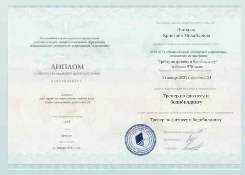 - НУСО, тренер по фитнесу и бодибилдингу, 2021 г.