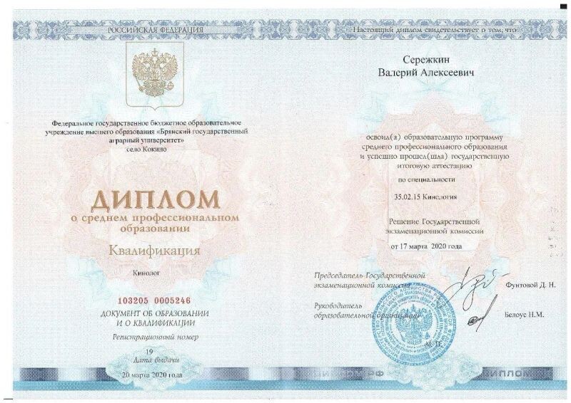 - ФГБОУ ВО «Брянский государственный аграрный университет», кинология, 2016–2020 гг.