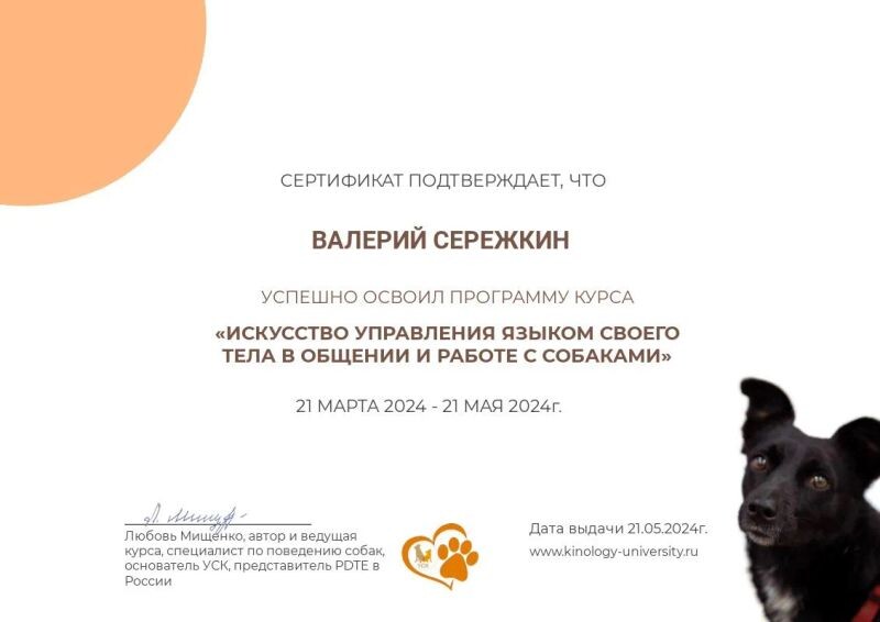 - Курс «Искусство управления языком своего тела в общении и работе с собаками», 2024 г.