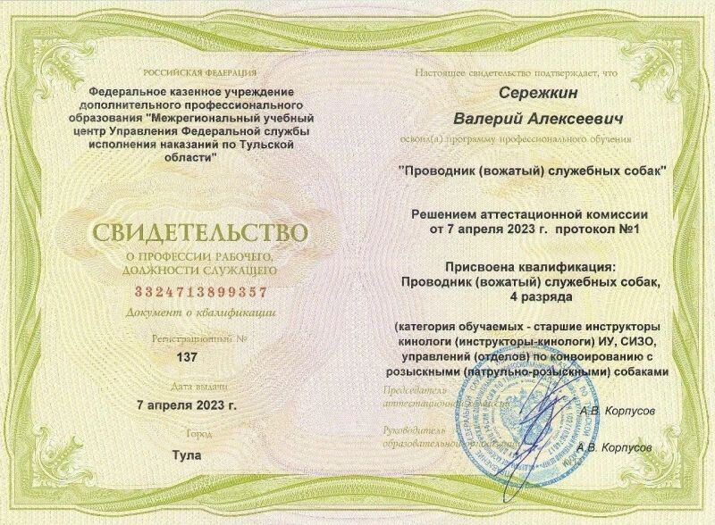 - Межрегиональный учебный центр управления Федеральной службы исполнения наказаний по Тульской области, программа «Проводник (вожатый) служебных собак», 2023 г.