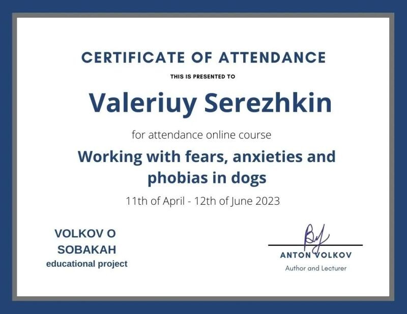 - Курс Антона Волкова «Работа со страхами, тревогами и фобиями у собак», 2023 г.