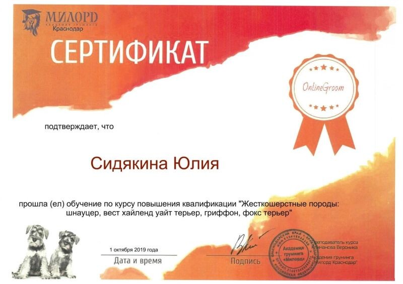 - Академия груминга «Милорд», курс повышения квалификации «Жесткошерстные породы», 2019 г.