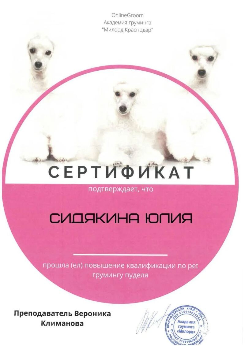 - Академии груминга «Милорд», курс повышения квалификации по породе пудель, 2019 г.