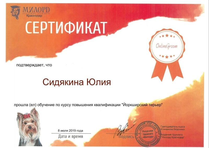 - Академии груминга «Милорд», повышение квалификации по породе йоркширский терьер, 2019 г.
