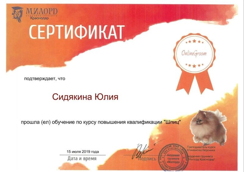 - Академия груминга «Милорд», повышение квалификации по породе шпиц, 2019 г.
