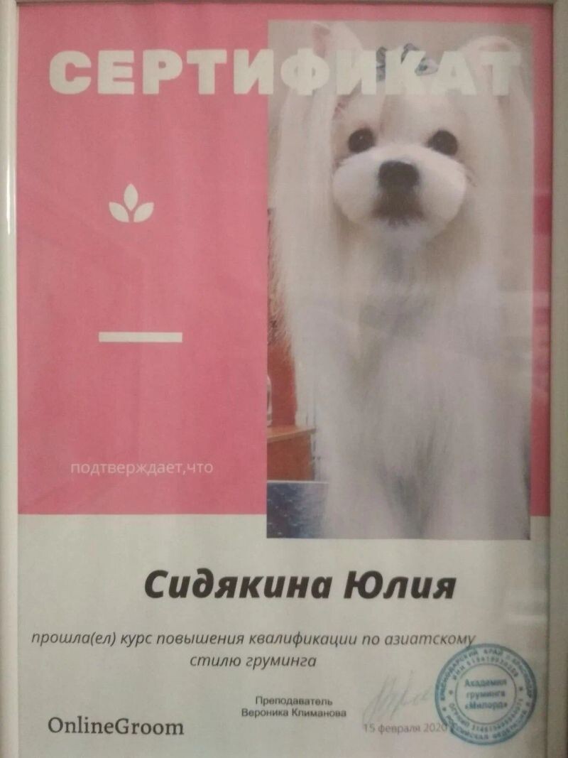 - Повышение квалификации академии груминга «Милорд» по азиатскому стилю, 2020 г.