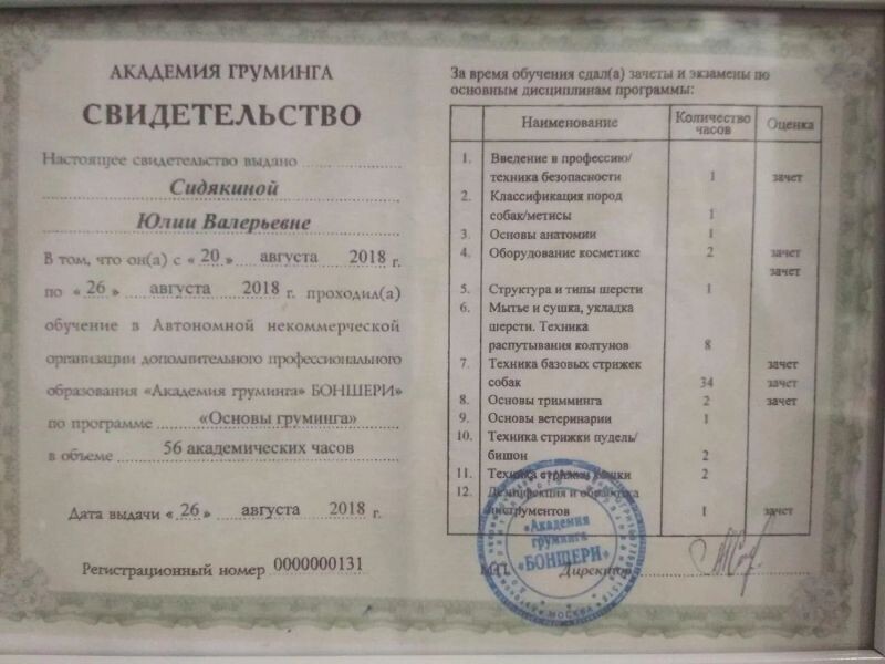 - Академия груминга «Боншери», курс «Основы груминга», 2018 г.